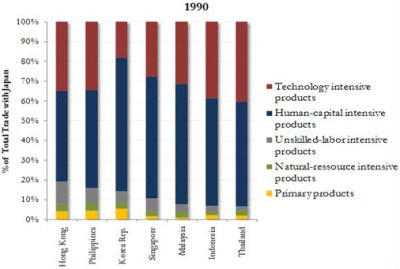 Unlike the Japan-Tigers connection, we find so far little evidence that China is fostering productivity growth in the region as Japan did for the East Asian economies in the past. Let’s start with the trade connection.