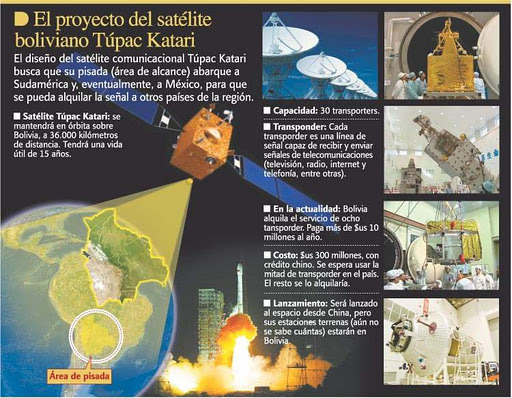 - China’s work on Bolivia’s Tupac Katari satellite continues. The satellite is scheduled for launch by 2013 or early 2014. Bolivia will also purchase six helicopters from China, according to a statement made by President Morales.