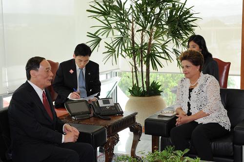 On February 13, 2012, Chinese Vice-Premier Wang Qishan met with Brazilian President Dilma Rousseff in Brasilia. Rousseff said Brazil-China ties have witnessed strong growth in recent years and that political mutual trust has been enhanced amid frequent high-level exchanges. Rousseff said Brazil views its ties with China from a global perspective and believes in the strategic importance of bilateral ties.