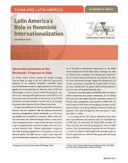 Addressing these issues, Inter-American Dialogue is pleased to publish this economic brief prepared by Jahangir Aziz, current Senior Asia Economist for JP Morgan Chase as well as former Principal Economic Advisor to India’s Ministry of Finance and former head of the IMF’s China Division. An expert on Asian models of economic growth, Aziz has written extensively on China’s banking sector reforms and financial sector development. In this paper, the third in a series of economics briefs published by the Inter-American Dialogue’s China and Latin America Program, Aziz examines Latin America’s role in China’s renminbi (RMB) internationalization process. He foresees low demand among Latin American nations for RMB-denominated transactions in coming years.
